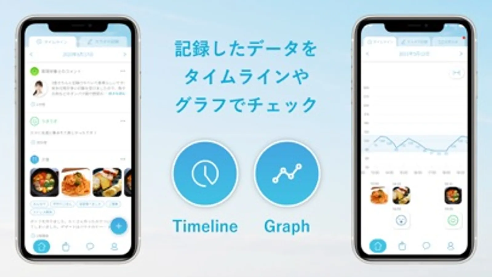 毎日の食事、気分の変化、血糖値の記録をタイムラインで見ることができます。