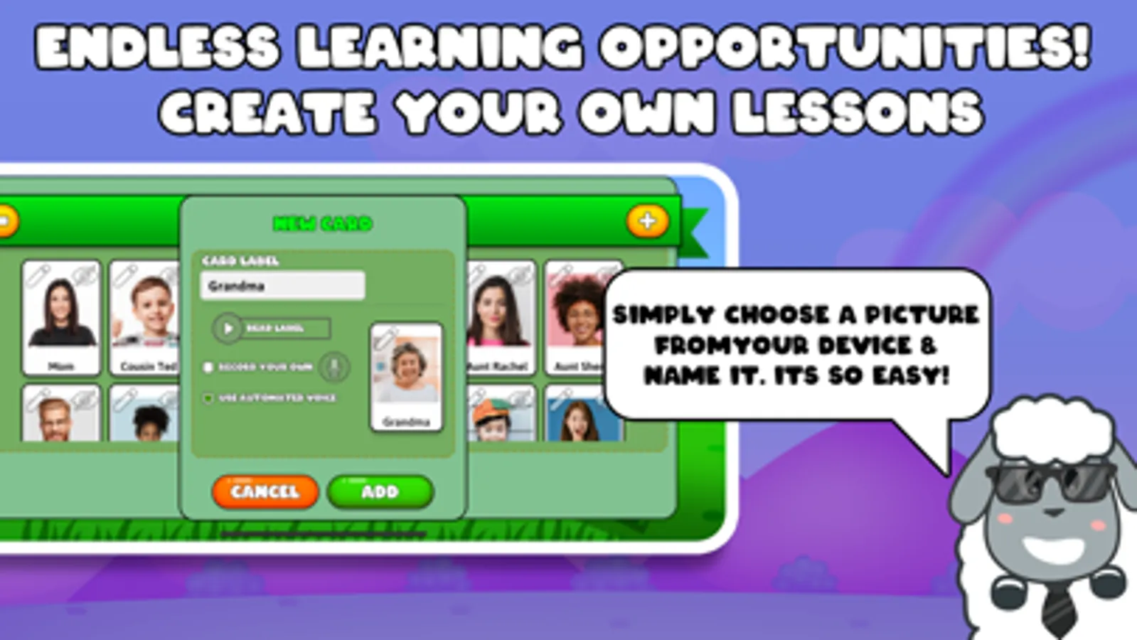 Create your own category of custom cards to teach your child exactly what you want them to learn. For example, some popular categories include Family Members, Relatives, Friends and Pets. The learning opportunities are endless. Simply choose a picture from your device, name the card and record yourself saying the name or use our automated voice. Its that easy!