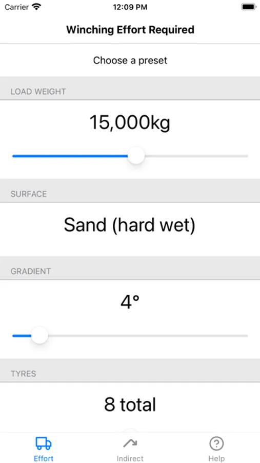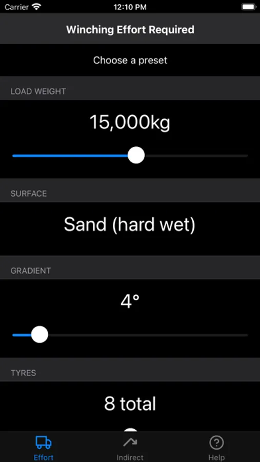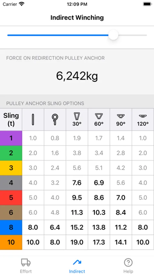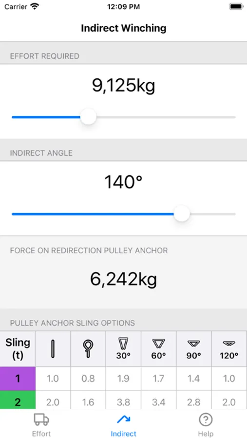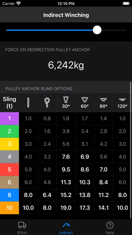 The Winching app calculates the approximate winching effort required based on vehicle weight, surface type, incline angle, and number of damaged wheels. When winching indirectly e.g. using a pulley to redirect the tow cable, the app can also approximate the strain placed on the anchor point, and suggest sling configurations that will support the required load.