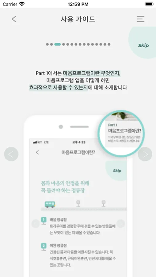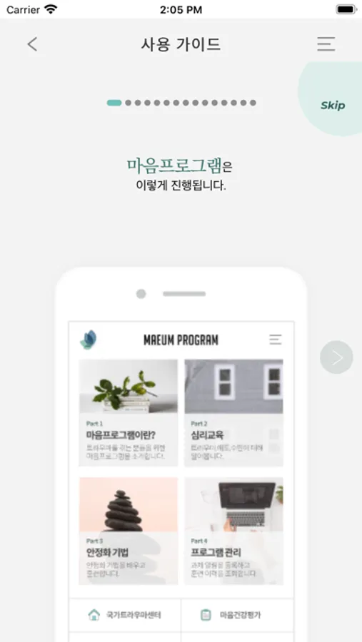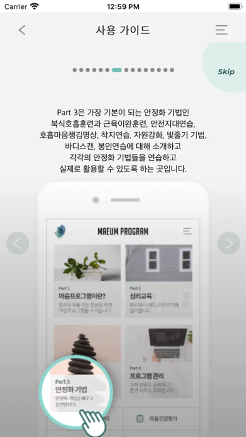 • 마음프로그램은 트라우마 치료의 입문 단계로, 스트레스 반응을 조절할 수 있는 안정화 기법을 배우고 훈련하여 심신의 안정을 돕는 프로그램입니다. 신체의 건강을 위해 꾸준히 운동을 하듯이 마음의 건강을 회복하기 위해서 마음프로그램을 꾸준히 연습하는 것이 중요합니다.