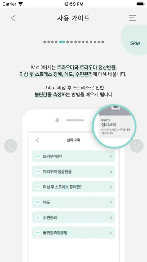 - 심리교육 : 트라우마, 애도, 수면에 대해 알아봅니다.