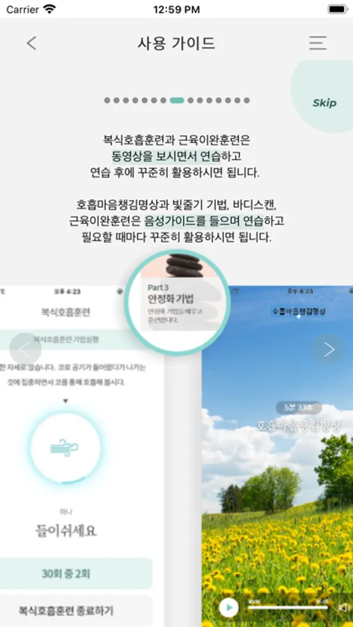 - 안정화 기법 : 복식호흡훈련, 근육이완훈련, 안전지대, 호흡마음챙김명상, 착지연습, 자원강화, 빛줄기 기법, 바디스캔, 봉인연습 등 트라우마로 인한 불편감을 감소시키거나, 스스로를 조절하는데 도움이 되는 기법들을 배우고 훈련합니다.