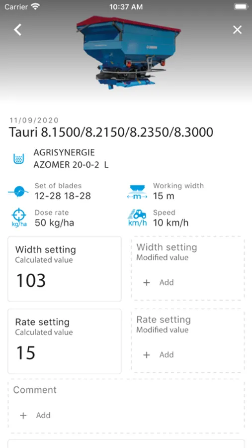 3. selecting the fertiliser spreader model and entering the type of throwing vane, working width, forward speed and the distribution rate
