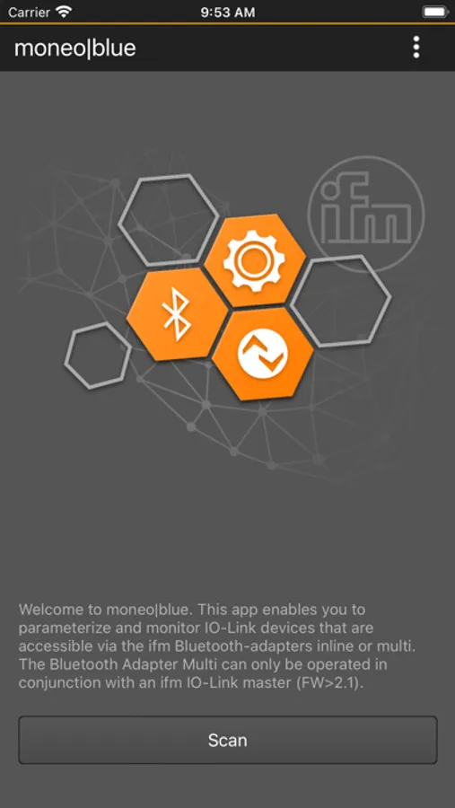 With the ifm moneo|blue app you can wirelessly connect to ifm IO-Link Masters (FW > V2.1) via the ifm inline and multi-Bluetooth Adapters (Art.Nr E30446 and EIO330), read IO-Link Process Data, Diagnostic Events, and Device Information from any IO-Link device. You communicate with the IO-Link devices without needing a PLC. You can set parameters of the IO-Link device (only with the ifm multi-plug Art.Nr:EIO330)via the App as well. Wizard-guided and graphically supported parameterisation of special ifm sensors (TCC, MVQ101, TN2105, LR2xxx) with the EIO330. Cross-manufacturer parameterisation possible, display and record of the process data.