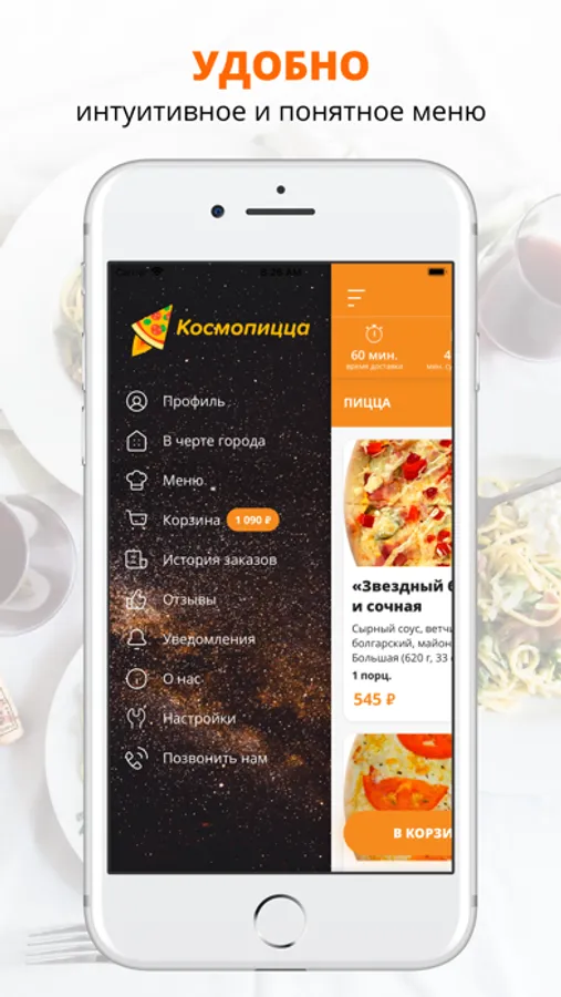 Наши курьеры бороздят космическое пространство со скоростью света. Пицца лежит в специальных космокапсулах, поэтому она всегда приезжает к вам свежей и горячей.