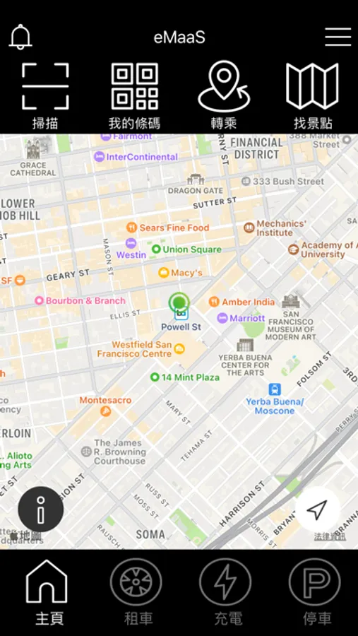 - 開啟定位:搜尋停車場空位數、立即租車及判斷附近景點距離