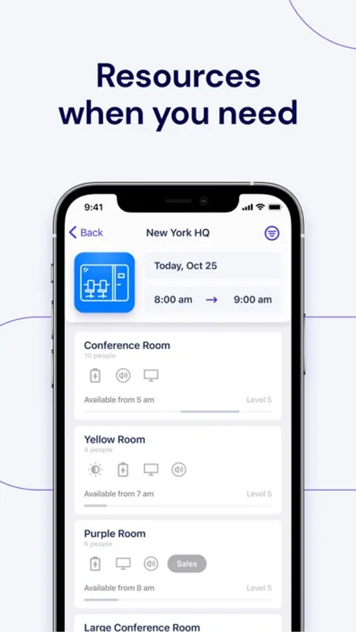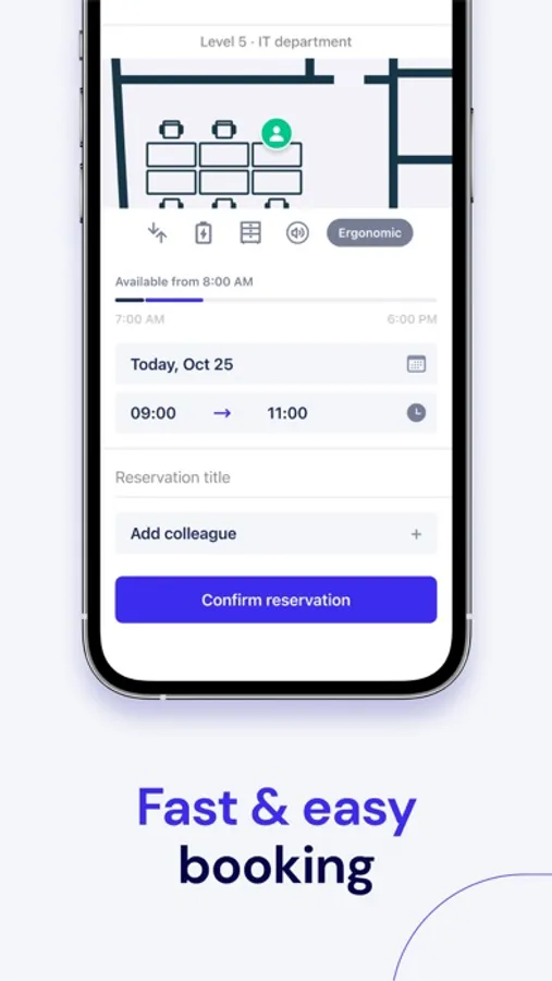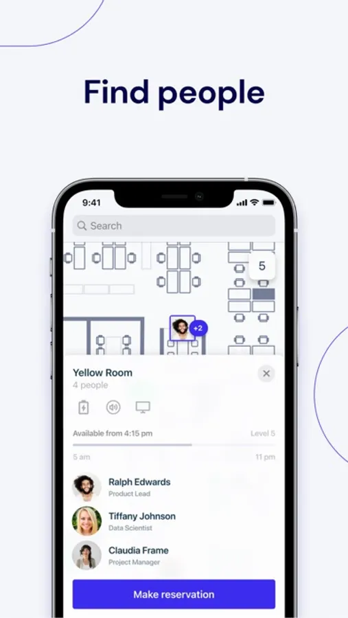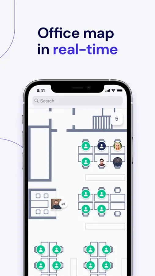 Main features are desk and meeting room bookings and check-in, people search on map, office KPIs, and issue reporting.