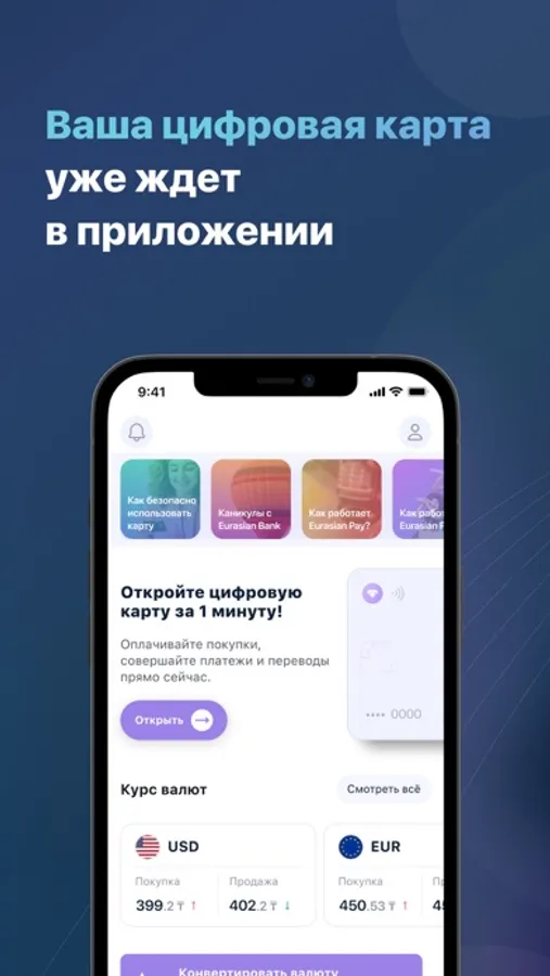 Smartbank-аударымдар, төлемдер және 100% онлайн режимінде картаны, депозитті, шотты ашу және несиені рәсімдеу, сондай-ақ күнделікті қажеттіліктеріңізге арналған басқа да қызметтер қолжетімді Eurasian Bank мобильді қосымшасы.
