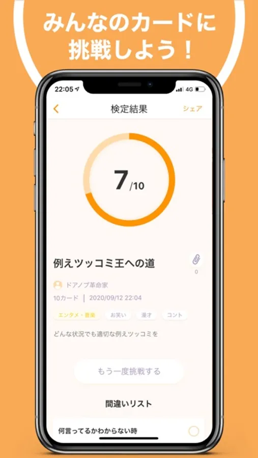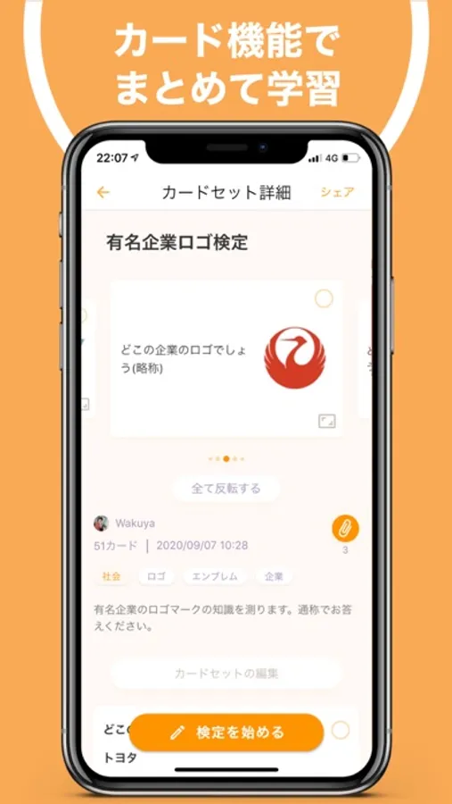 作成されたカードセットを元に、検定を学習に最適化されたプログラムで自動生成。勉強の進捗チェックだけでなく、趣味の共有やクイズバトルにも!間違えたカードは一覧で表示、復習にもバッチリだぜ!