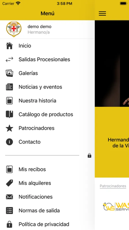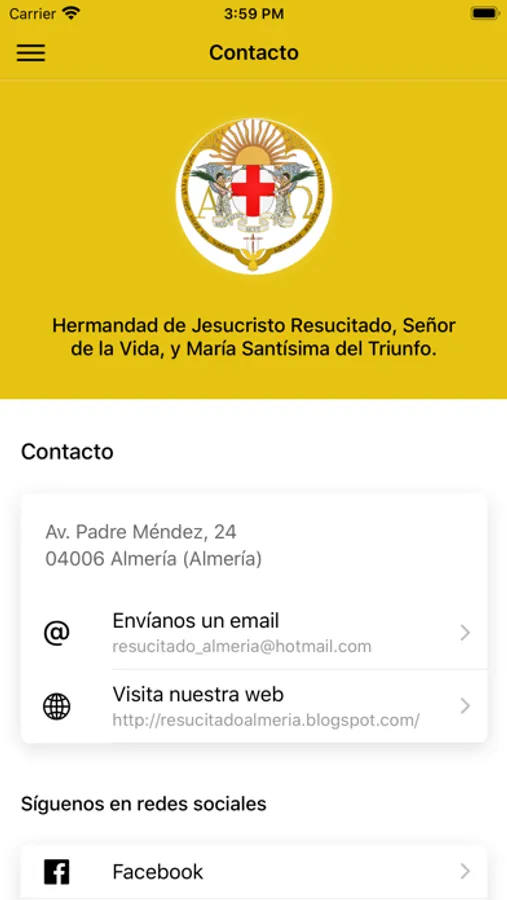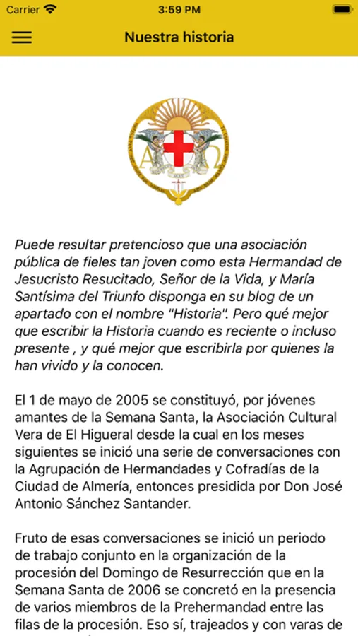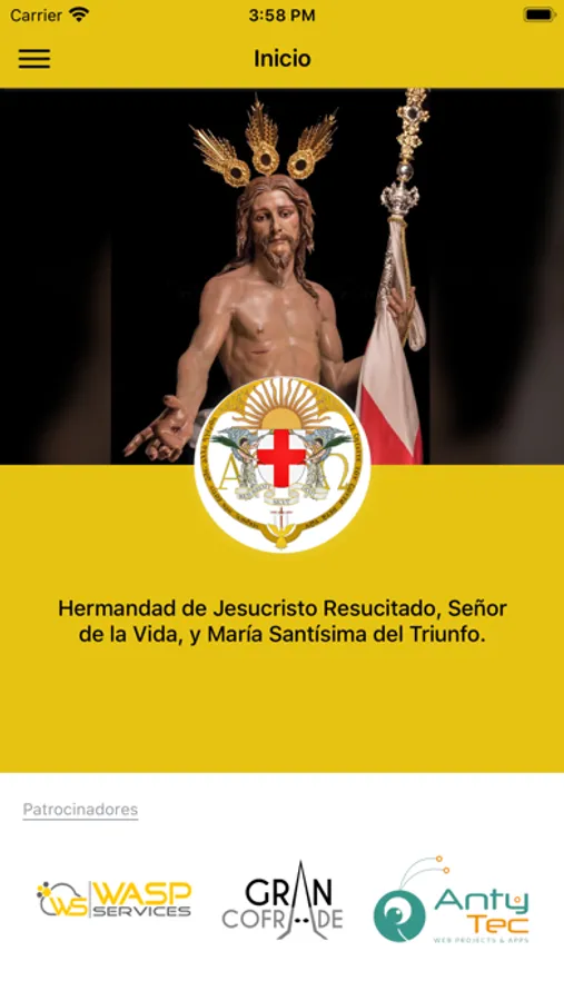 Aplicación Oficial de la Hermandad de Jesucristo Resucitado, Señor de la Vida, y María Santísima del Triunfo de Almería, próximas salidas y acceso identificado para los hermanos/as en el que pueden consultar/modificar sus datos personales, consultar recibos y recibir notificaciones de la Cofradía.