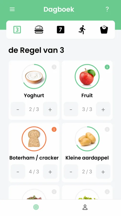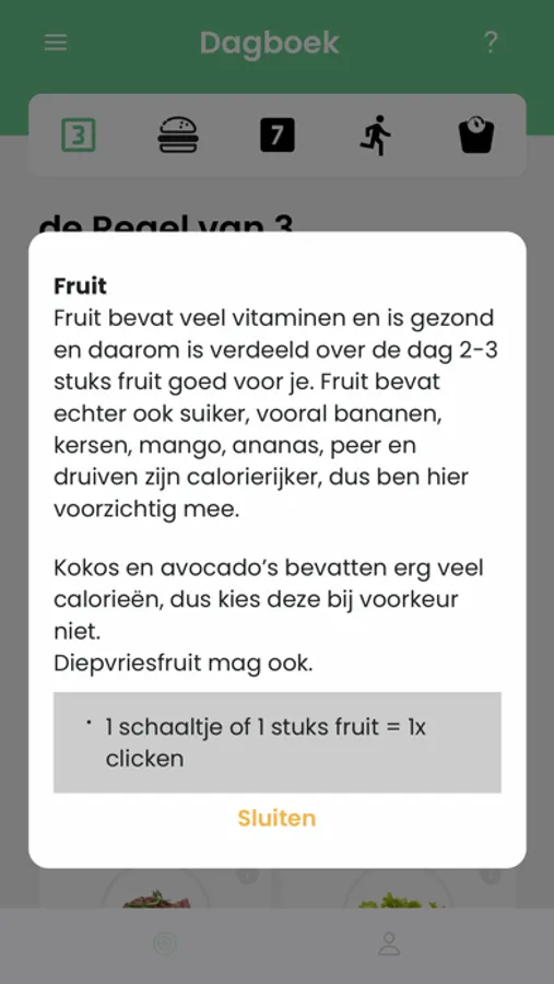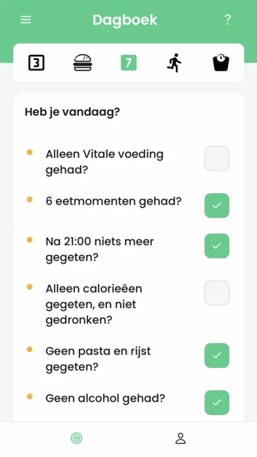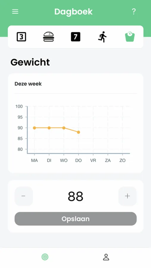 Je kunt in het dagboek eenvoudig in “de Regel van 3 en de 7 Afspraken” je gedrag registreren en hoeveel je hebt gegeten. Ook registreer je hoeveel je dagelijks hebt bewogen en natuurlijk kun je je gewicht bijhouden in een grafiek.