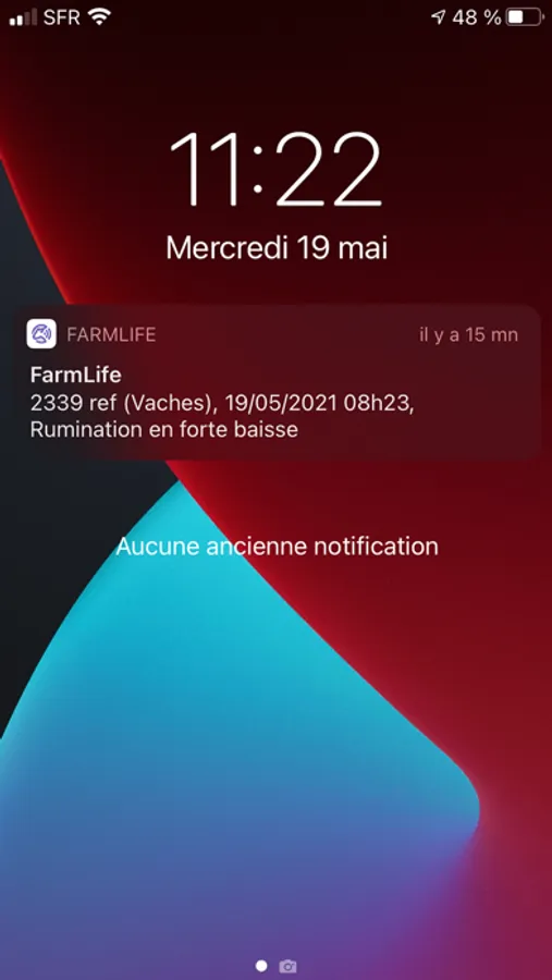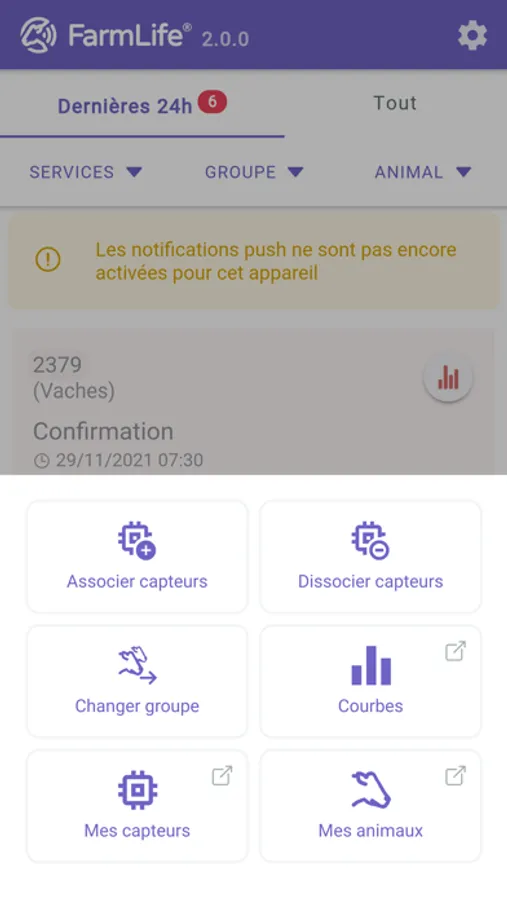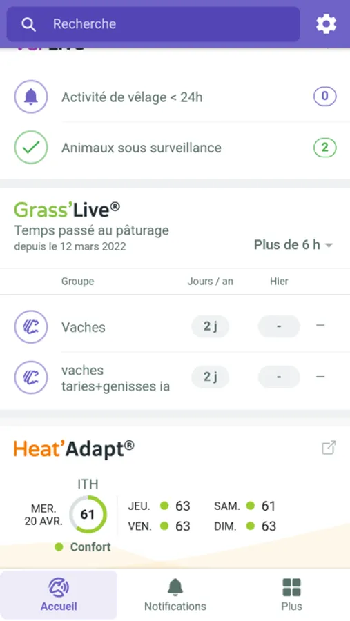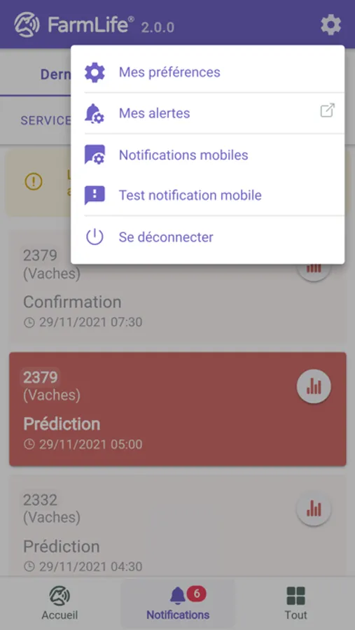 Retrouvez toutes les fonctionnalités de FarmLife® sur l’application mobile et adoptez les notifications : détection de chaleurs, prédiction de vêlage, suivi de l'alimentation et suivi de la santé du troupeau et de chaque animal.