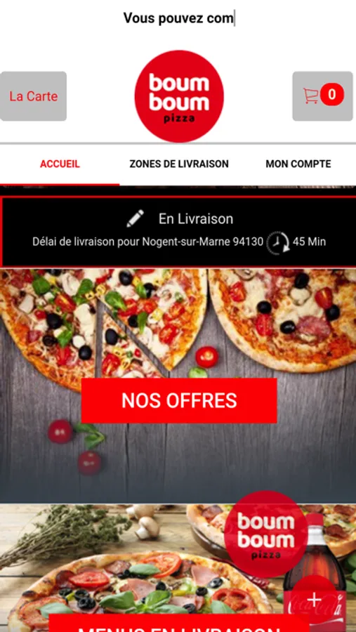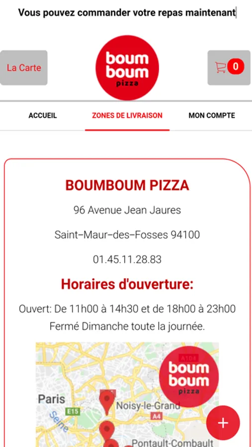 L'application BOUM BOUM PIZZA vous permet de commander en ligne ou par téléphone via votre application . Vous pouvez consulter notre carte et choisir vos produits .