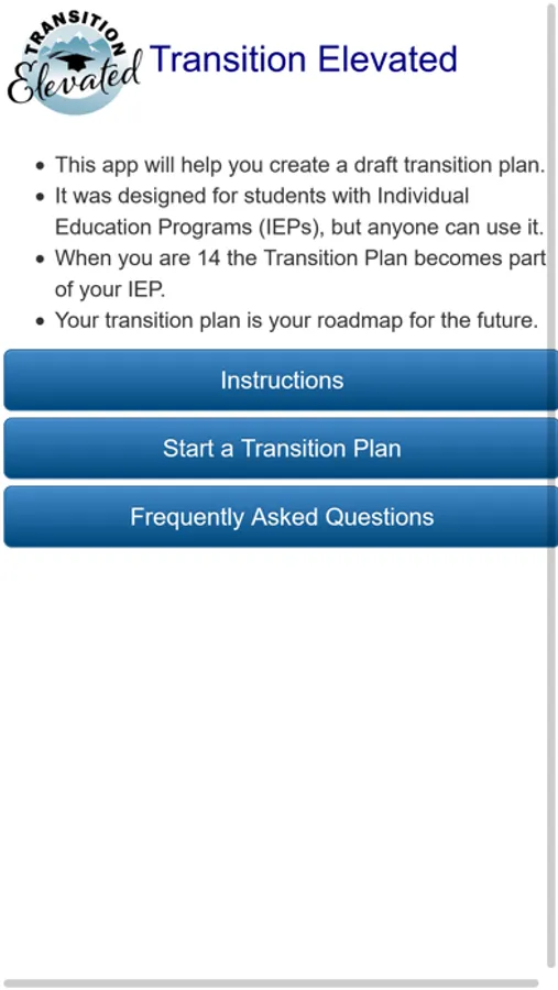 This app is a tool for developing a transition plan for high-school aged students with disabilities who have an IEP (Individualized Education Program). An IEP details special education services. A transition plan is part of the IEP, for students who are 16 years old and older. This plan helps the student move into adult life after high school. To develop your transition plan, you answer the questions in the brief 10 minute survey, and the app will produce your individualized draft transition plan based on your answers. You can then print your draft transition plan and take it to your IEP meeting. You can also email a copy of your plan to yourself or others you want to share it with. If you want to change your plan, it is easy. Just fill out the survey again, provide new or additional information, and the app will generate your new transition plan.