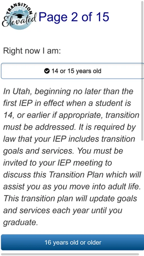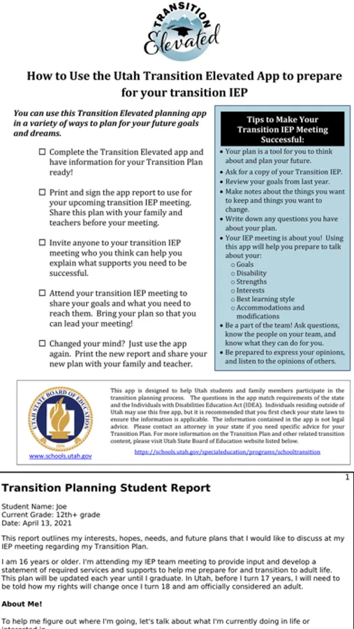 This app is intended to serve as a tool for Utah students, family members, and educators during the transition planning process. It is based on the requirements of the Individuals with Disabilities Education Act (IDEA) - https://sites.ed.gov/idea/. As a Utah student with a disability who may be turning 16 years or older, or a family member of a transition age student, this app can help prepare for IEP meetings where transition planning will be discussed and the transition plan will be developed, and/or modified. Individuals residing outside of Utah may use this free app, but the information needed for transition plans in other states may be different. The information in this app is for general information purposes only, it is not legal advice.