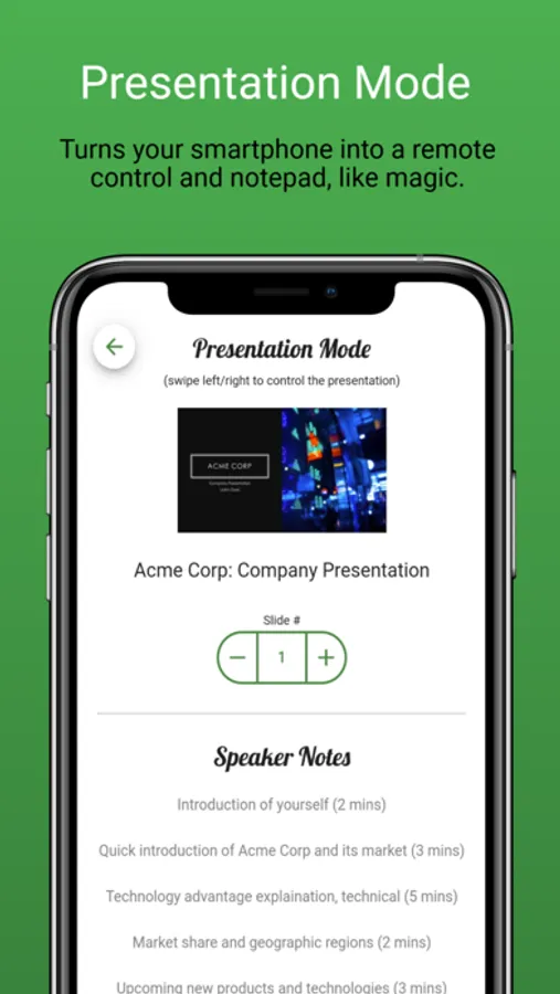 Use your smartphone to cast securely your presentations decks on whatever screen in the world, as long as it's connected to the internet.