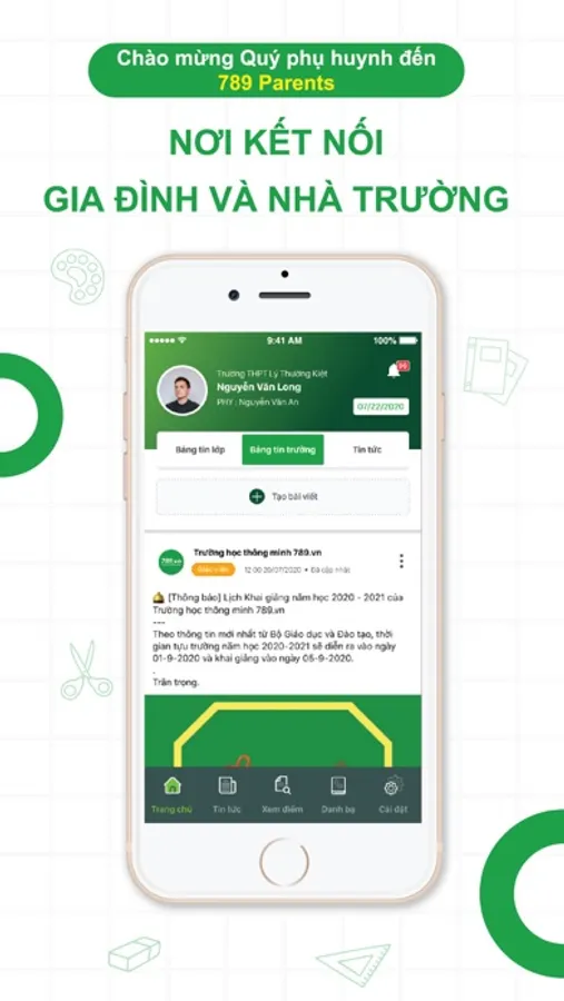 Với Phụ huynh, sẽ được nhận trực tiếp những thông báo, tin tức từ Nhà trường, đảm bảo tiếp nhận thông tin chính xác cũng như không bị lỡ bất kỳ nội dung nào. Các kết quả học tập cũng được gửi trực tuyến cho phụ huynh tại 789 Parent. Mọi thắc mắc, phụ huynh có thể trao đổi trực tiếp với Nhà trường, giáo viên thông qua 789 Parent. Đây còn là nơi lưu trữ những khoảnh khắc tuổi học trò tuyệt đẹp của con em khi ngồi trên ghế Nhà trường.