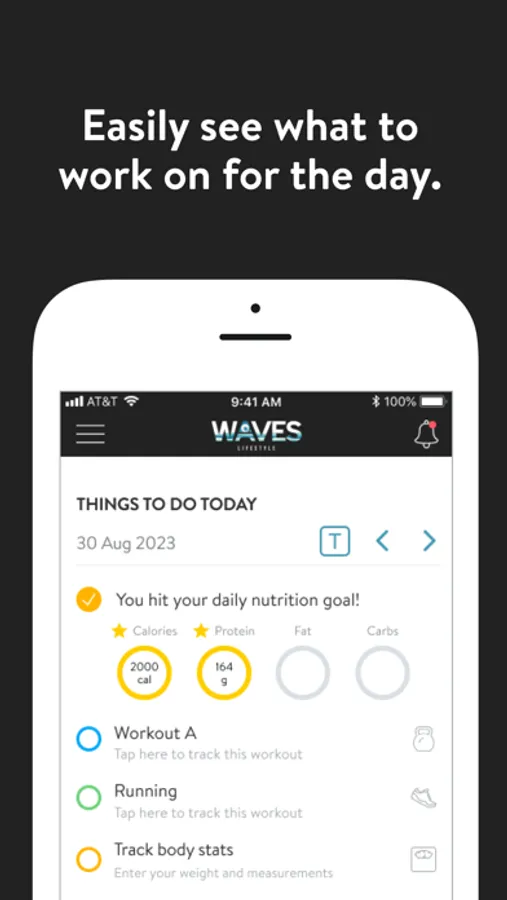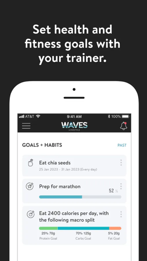 With the Waves Lifestyle App, you can start tracking your workouts and meals, measuring results, and achieving your fitness goals, all with the help of your personal trainer.