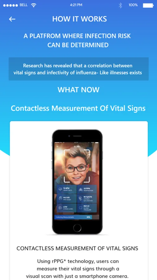Awareness AI’s advance ML algorithms allow the measurement of a person’s vital signs by analysing a video taken of the upper cheek region of a person’s face, using rPPG and PPG methodologies. No video of the eyes or any identifiable features is used.