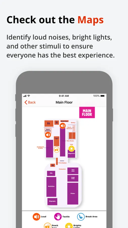 The NPL for All app helps all children, adults and families, including those with autism or other sensory needs, engage with us. In the app, you will be able to learn more about our programs, create your own schedule for a visit to the library, play a game, and check out features like our sensory-friendly map and insider tips.