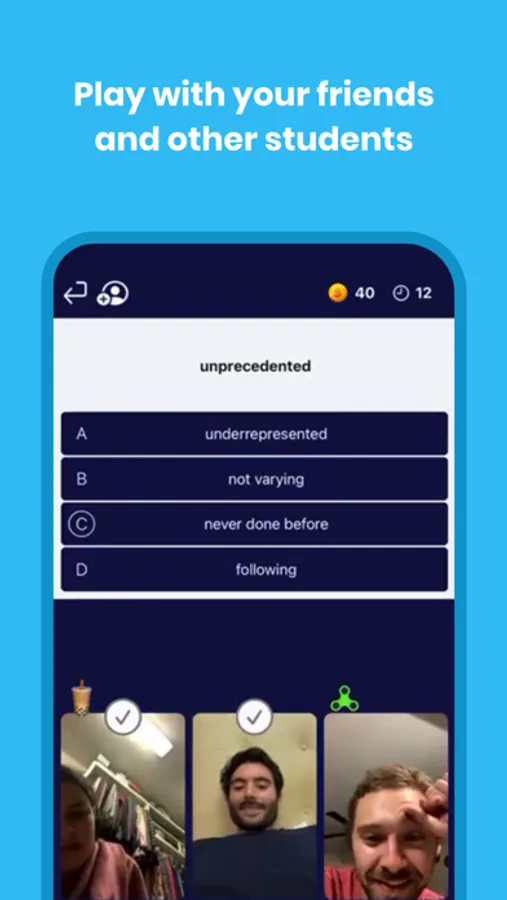 StudyParty is the most fun and effective way to study for your high school and college exams. Join live quiz rooms with other students, and create your own with friends. StudyParty has thousands of real test questions to help you prepare, as well as explanations for every question. Earn coins for every correct answer and track your progress and scores. Compete for weekly prizes on the leaderboard. StudyParty is free to use and has no ads.