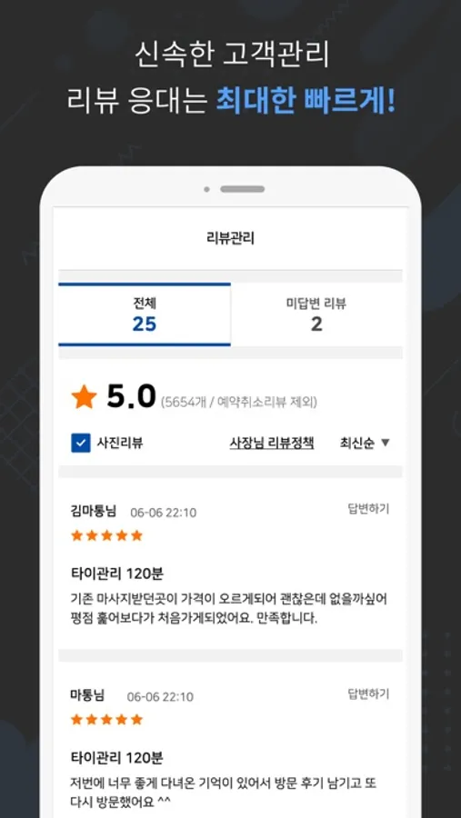 - 실시간 리뷰 확인 및 답변 작성을 통해 사용자에게 신뢰감을 줄수 있습니다.