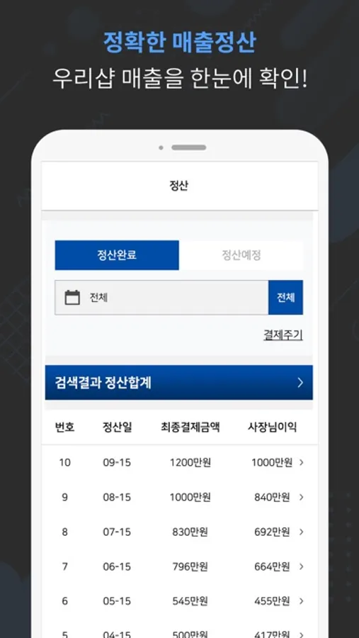 - 바로결제를 통한 샵 매출 정산을 기간별로 확인 가능합니다.