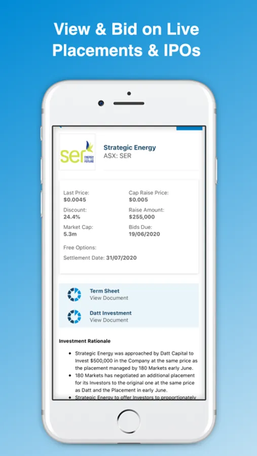 Track your performance better with 180 Markets: We make it simple to see your P&L and analyze your trade history. Not ready to jump in yet? No problem. Just register with your name and email address and start viewing and learning all about live capital raisings. Whenever you’re comfortable, you can upgrade to a live account.