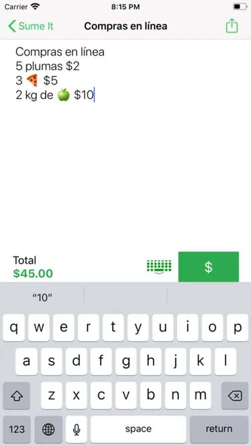 Solo escribe 3 pizzas $5, y automáticamente Sume It hará la multiplicación