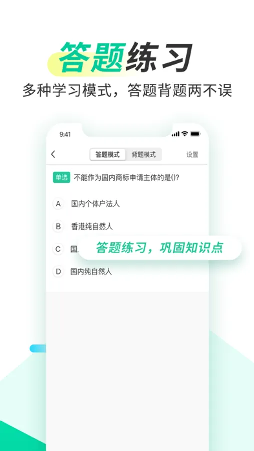 软件同时提供了两种练习模式,答题模式与背题模式,通过答题模式,用户可以两者集合在试错、总结中从入门到精通掌握知识产权系列知识。