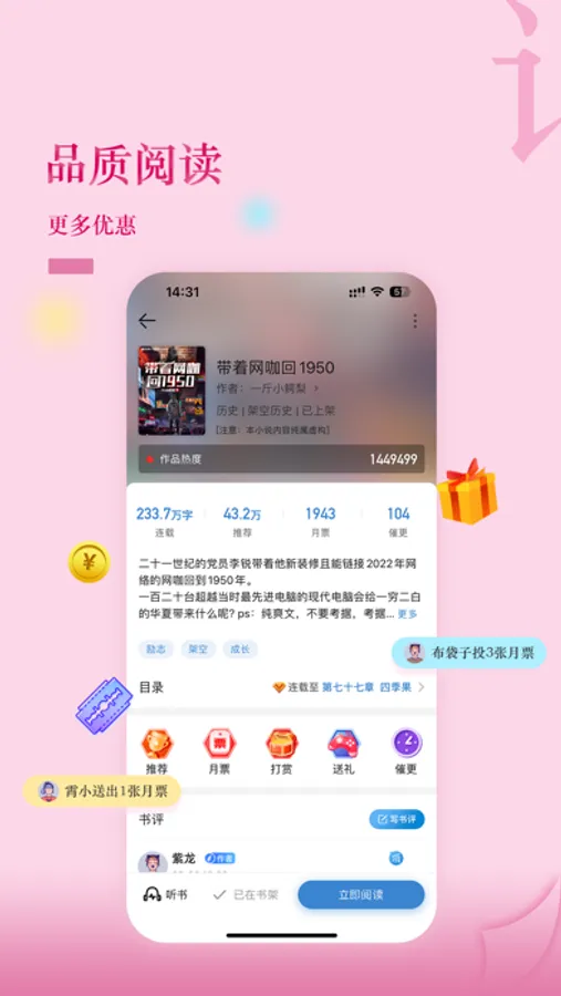 【打造精品】息壤阅读倡导精品创作,风格兼容包蓄,以内涵承载价值理念的付费阅读为核心,打造优秀的互动载体,创作提倡求精、求新、求变,不落窠臼、不甘平凡,为精品阅读提供不断茁壮成长的土壤,为网络文学注入更多新鲜活力。