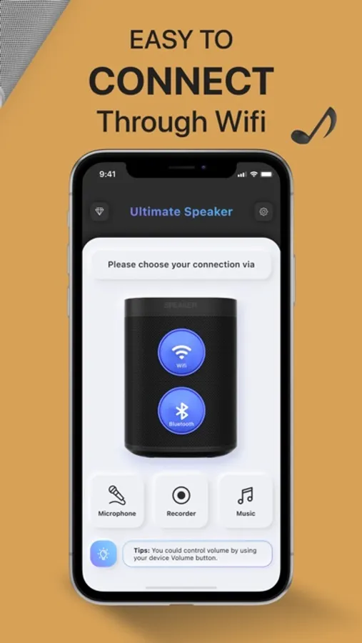 Connect our app to your Speakers via Wifi or Bluetooth and play Music from your phone Library. Search through your favorite songs and adjust volume.