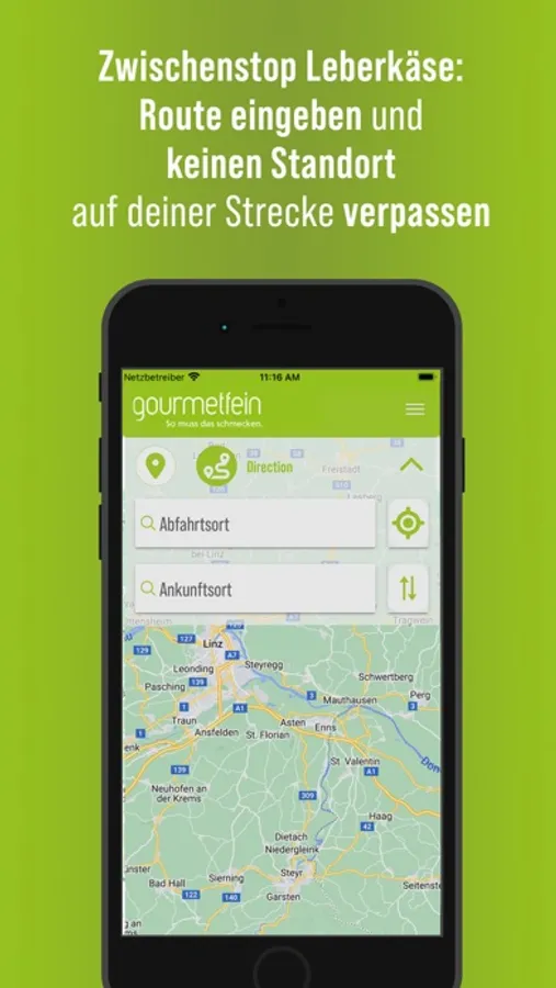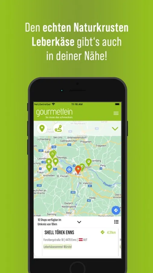Mit dem gourmetfein Leberkäse Finder musst du auch unterwegs nicht mehr auf beste österreichische Qualität verzichten. Der gourmetfein Leberkäse Finder führt dich schnell und unkompliziert zum gourmetfein Partner in deiner Nähe. Sie ist der perfekte Wegbegleiter für alle Leberkäsefans, die wissen wollen, woher das Fleisch im Produkt kommt. Gib einfach eine beliebige Adresse ein, an der du nach einem gourmetfein Partner suchen möchtest oder verwende dein GPS Signal für die aktuelle Standortsuche. Der integrierte Routenplaner zeigt dir den Weg zu den nächsten gourmetfein Partnern, egal ob du mit dem Auto, dem Rad, mit den öffentlichen Verkehrsmitteln oder zu Fuß unterwegs bist. Unsere Partner freuen sich auf deinen Besuch!
