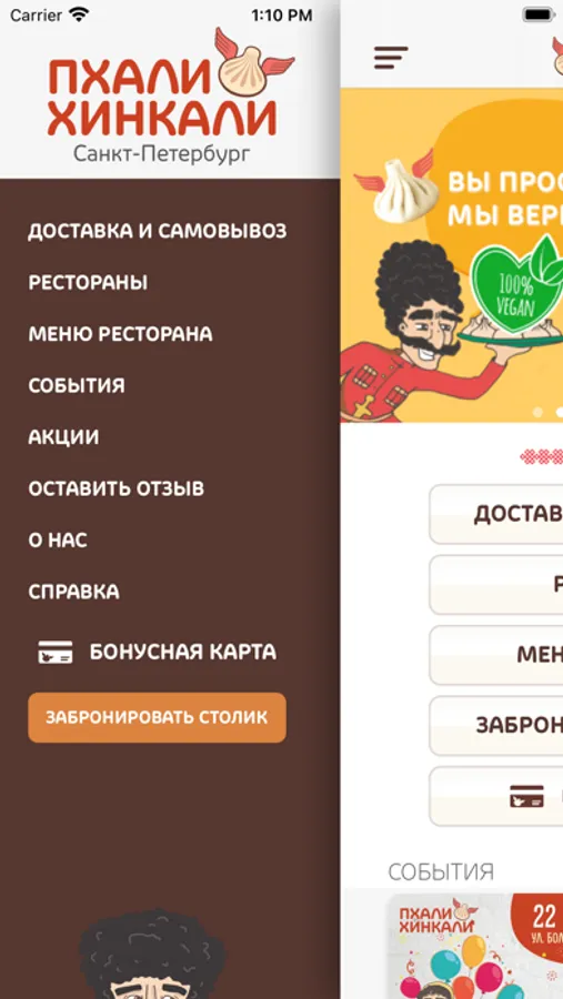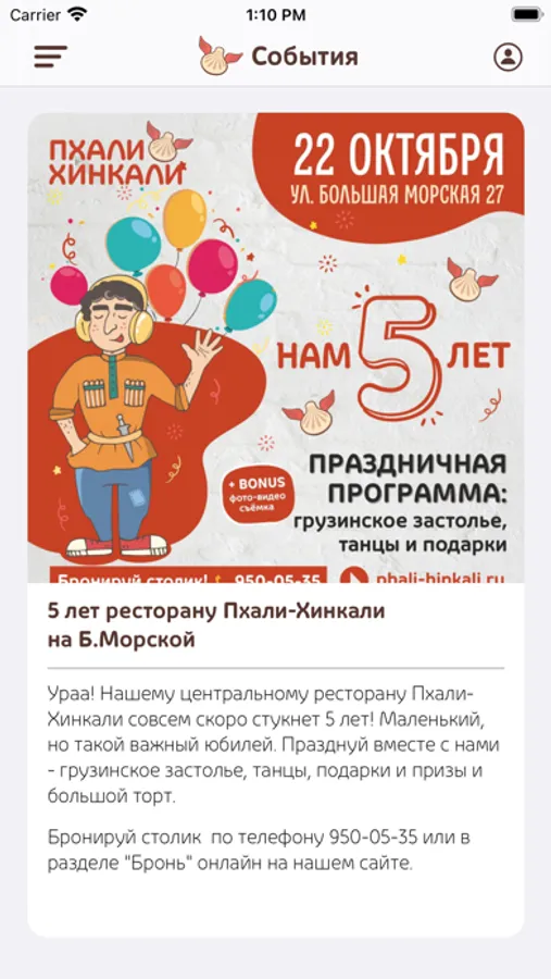 Мобильное приложение семьи ресторанов "Пхали-Хинкали" поможет вам найти ближайший ресторан, ознакомиться с меню и интерьерами ресторанов, забронировать столик. Также вы можете, не покидая приложения, заказать доставку или самовывоз великолепных блюд грузинской кухни и отслеживать свой заказ. Функционал позволяет увидеть текущее количество бонусов на карте и историю заказов в вашем личном кабинете.