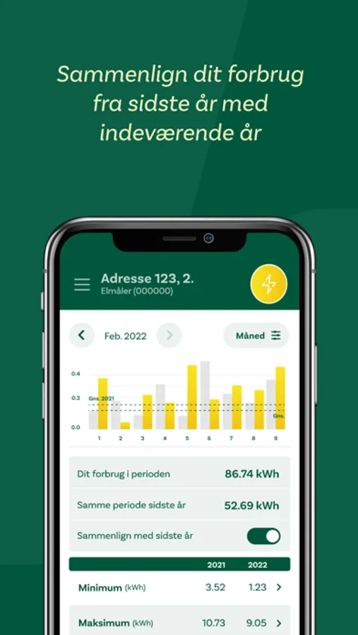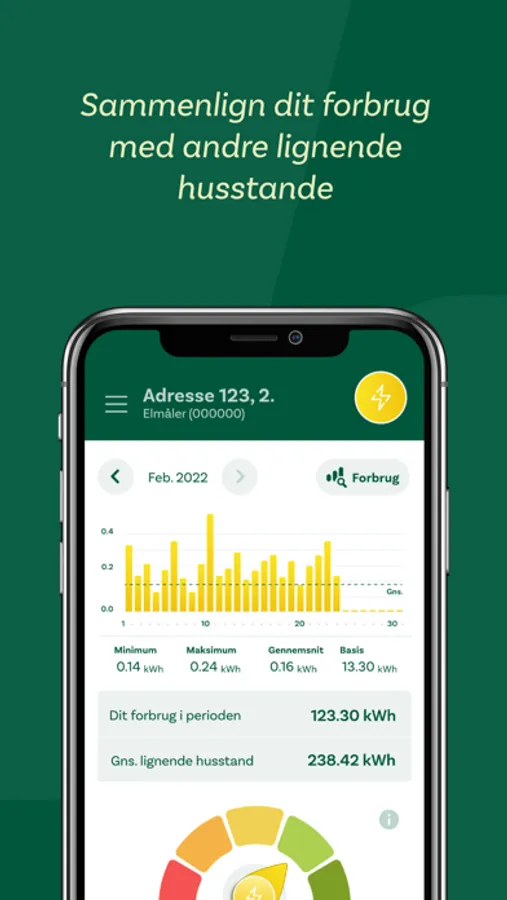 Med Energi Fyns app har du hele tiden et overblik over, hvordan dit forbrug fordeler sig hen over døgnet, ugen, kvartalet og året. Du kan også sammenligne perioden med tilsvarende periode sidste år. Du kan sammenligne dit forbrug, så du kan se, om du bruger mere eller mindre end normalen for en sammenlignelig husstand.