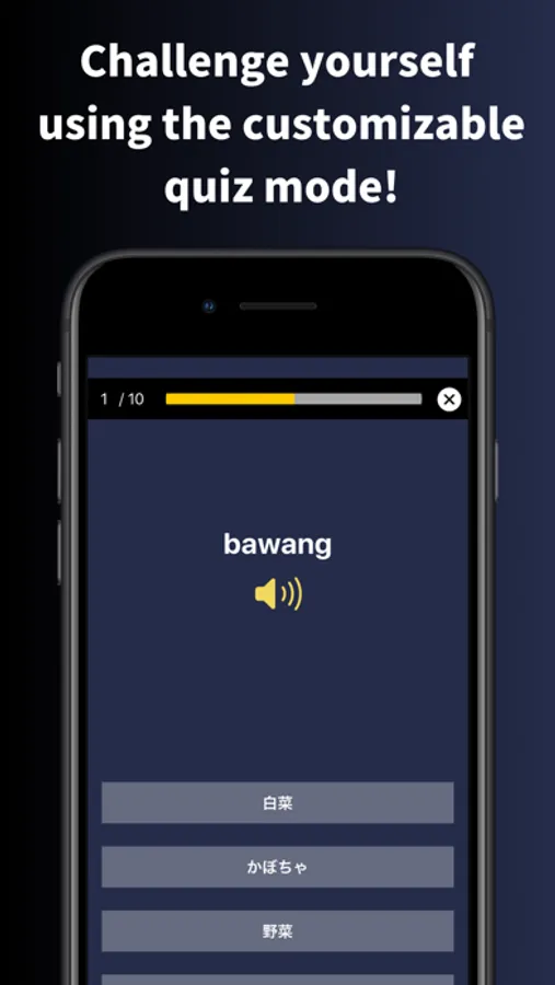 There are two quiz modes, "Tagalog → English" and “English → Tagalog”.