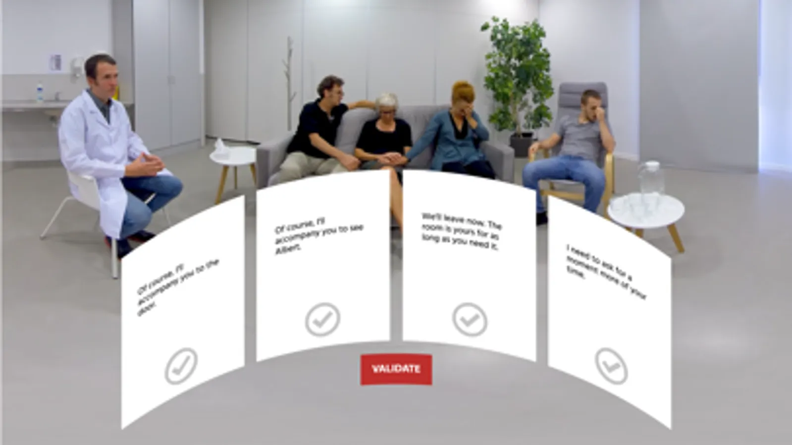 Using VR cardboard glasses, students will find themselves in front of the patient’s family, they will make decisions that will affect the course of the experience, they will get personalized feedback on their decisions and they will be provided with a final debriefing.