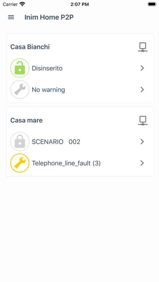 The InimHome P2P App provides remote control via smartphone of SmartLiving, Prime and Sol systems made by Inim™ Electronics. You can remotely control your home and office by issuing intrusion and home-automation commands conveniently from your mobile device, anytime, anywhere. InimHome supports all display sizes and provides an interface with intuitive icons that facilitate operations. The array of functions is complete: with just a few taps you can arm, disarm or partly disarm the intrusion alarm system, access scenarios, check the status of detectors, outputs and any system faults, read the events log; you can also activate air conditioners, sprinklers, lights and much more. Through InimHome it is possible to control multiple SmartLiving, Prime and Sol systems: thanks to the multi-panel management function you can interact with numerous systems, without limits. In this way you can control all of your systems in a collective way (home, office, business premises and so forth). InimHome also offers the chronothermostat function which allows you to adjust the temperature of the different ambients. Interaction with cameras is also possible and permits video verification in real-time: InimHome allows you to associate one or more cameras to a zone and display on the smartphone the real-time video of the cameras activated in the event of an alarm in the zone. If cameras with ONVIF standard are used it is possible to manage the camera movements and zoom outs as well as view multiple cameras simultaneously.