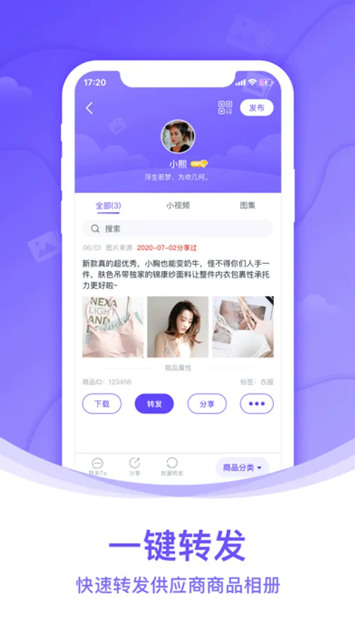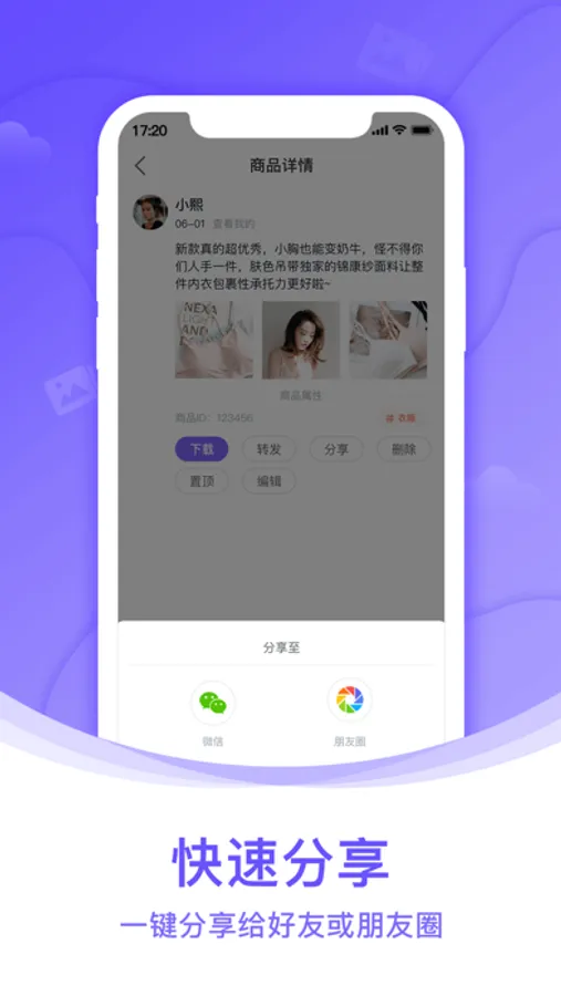 *它具备商品图文云存储、团队云协作一键转图、多社交渠道分享等功能,每个环节为您节省时间,是你管理上游供应商与下游粉丝的得力助手,也是每个生意人在移动端做生意的必备工具。