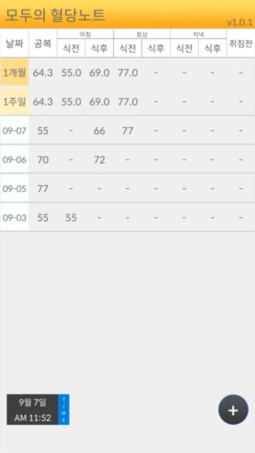 화면 우측 하단에 위치한 버튼을 통해 오늘 혈당을 관리할 수 있습니다.