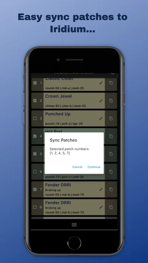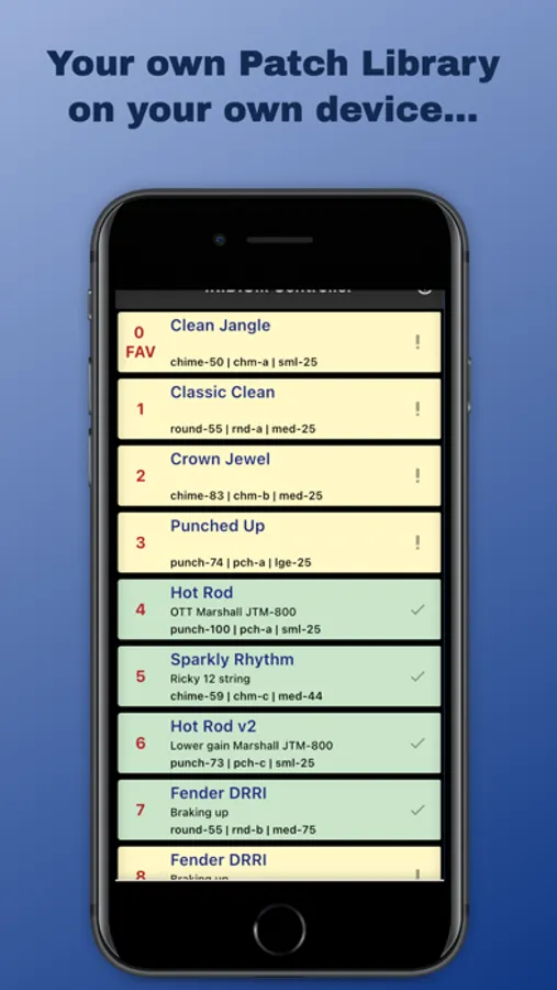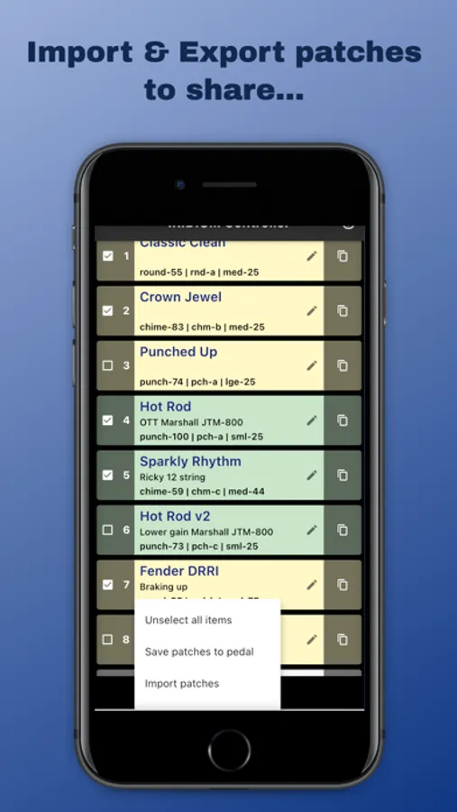 Import and Export selected patches to your device, iCloud, Airdrop, messenger etc. Good for backing up, having setlists or sharing with others.