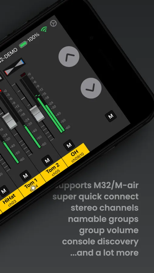 It features stereo channels to save screen real-estate, namable groups and automatic console discovery. Musicians can control the send levels into their monitoring mix bus for all channels aux tracks and effects returns.