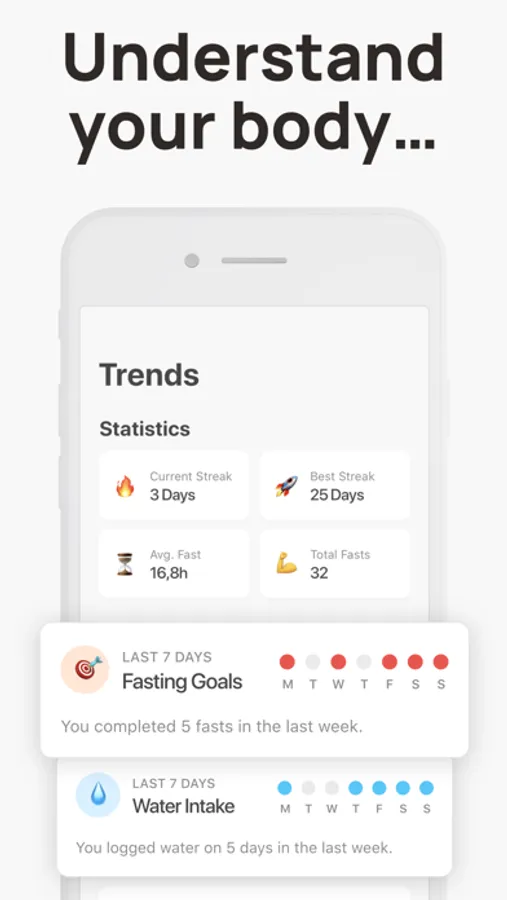 Witness your fasting progress come to life with easy-to-understand visuals. Our daily, weekly, and monthly charts and graphs let you see your accomplishments at a glance, motivating you to keep going and celebrate each milestone along the way.