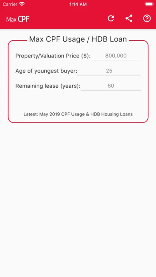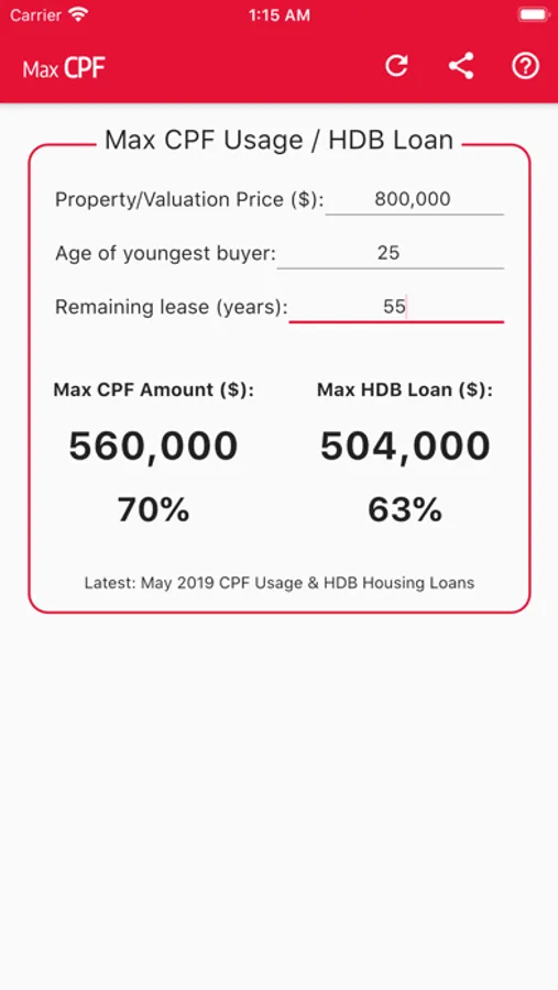 Calculator to check the maximum CPF usage and HDB loan based on the new rules on total use of CPF (with effect from 10 May 2019)