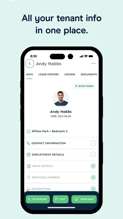 Click to call, text or email straight from the tenant or supplier contact information.