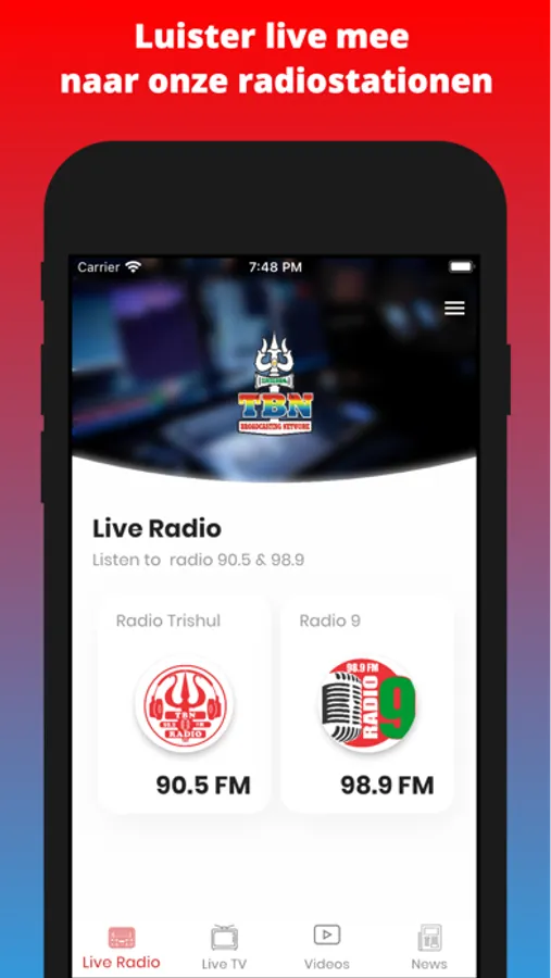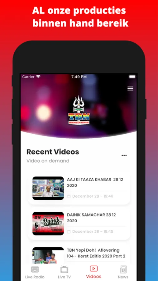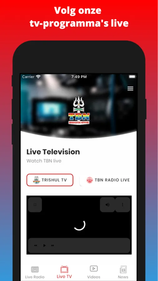 Watch and listen to all programs from Trishul Broadcasting Network (Suriname) in one app. In the TBN app you can listen to the various radio stations of Trishul Broadcasting Network anytime anywhere. Also watch channel 20.1 Trishul Television live for the latest movies, shows and local productions.