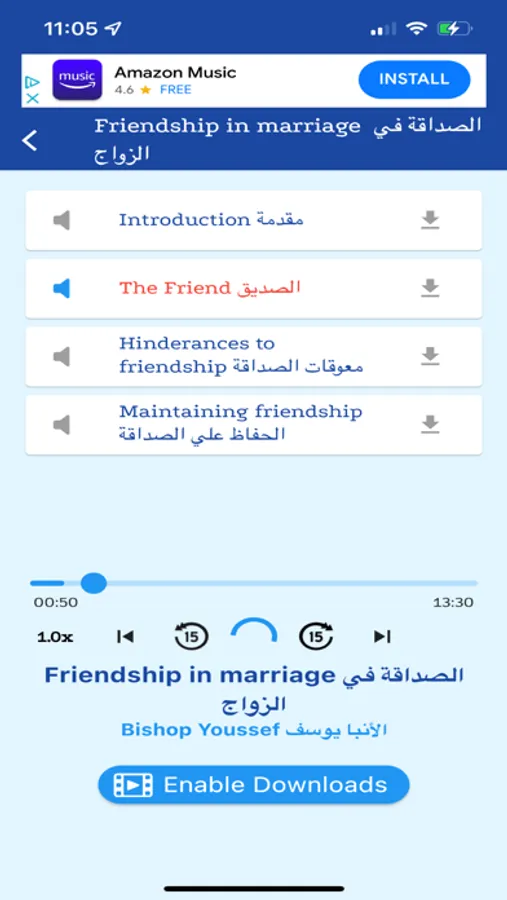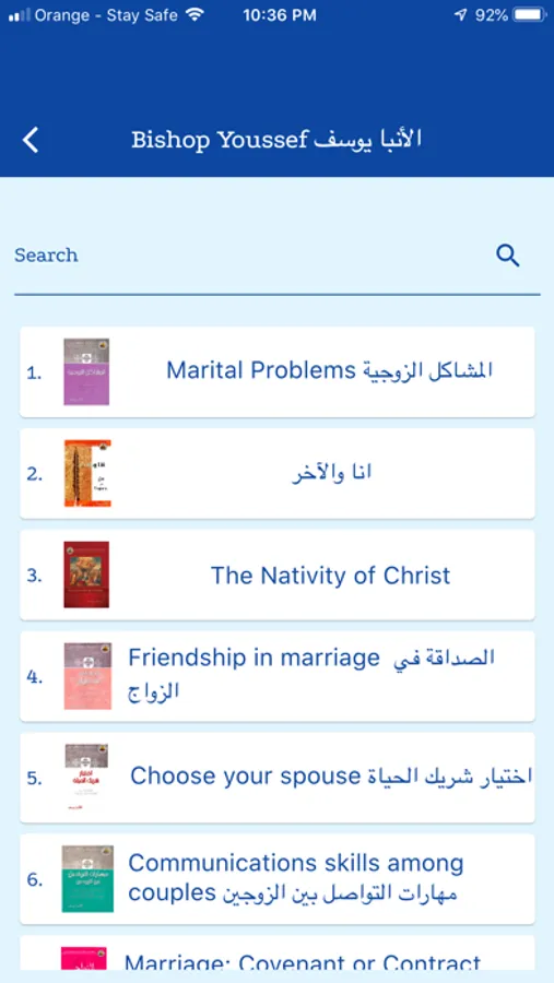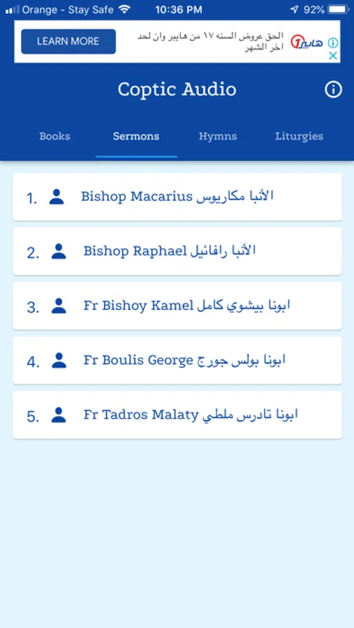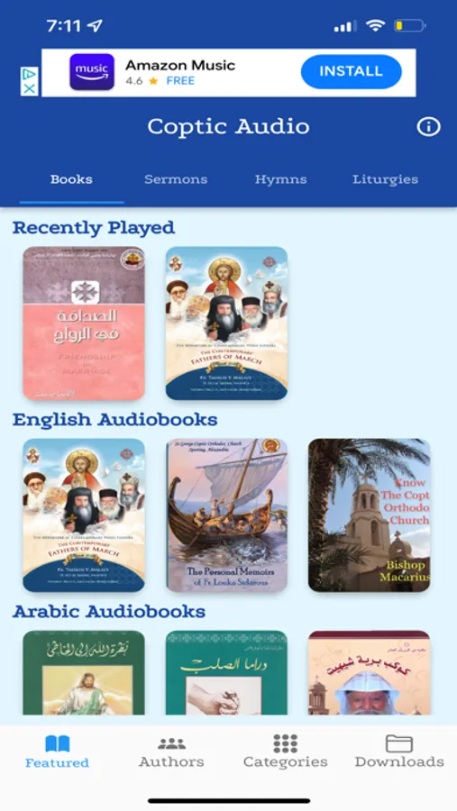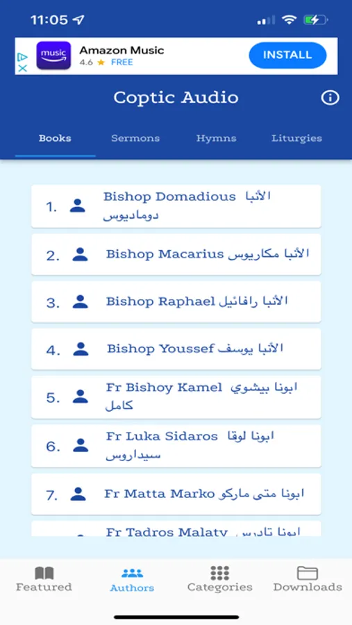 The application currently has audiobooks for Pope Shenouda III, Late Bishop Youannes, Bishop Youssef (Southern USA), Bishop Macarius (El Menia), Bishop Raphael and Fr Tadros Malaty.