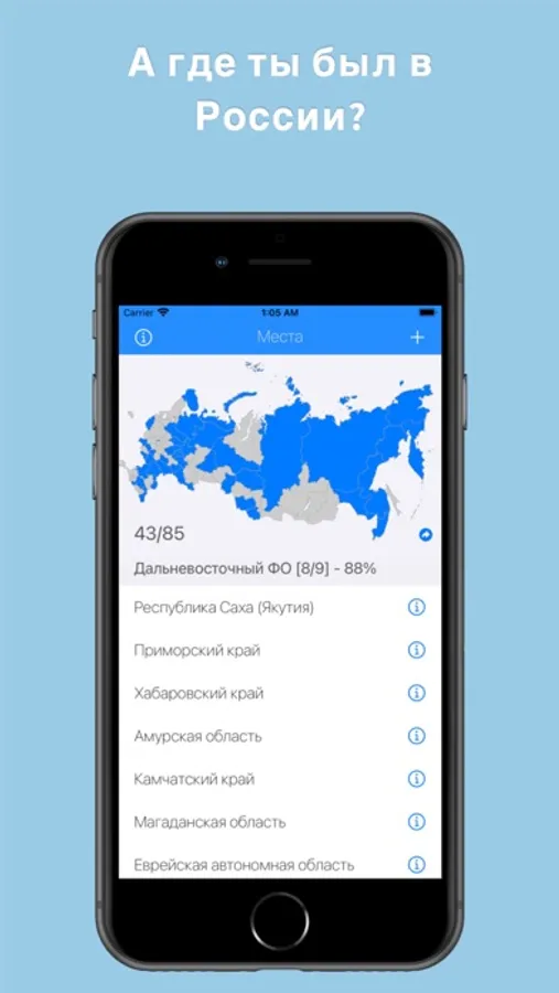 Представляем вам приложение, в котором вы сможете отмечать в каких регионах России вы были! Довольно много существует приложений, которые отмечают в каких странах ты был и дает информацию о проценте посещенных стран. Наша команда сделала приложение для нашей большой страны, для России.