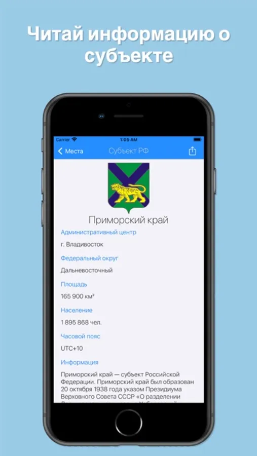 Приложение имеет все субъекты из 8 Федеральных округов. Дает краткую информацию по каждому субъекту, которая может быть интересной, а еще и полезной. При добавлении субъекта организован поиск, который заметно сократит ваш поиск.