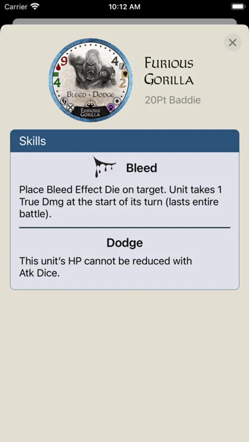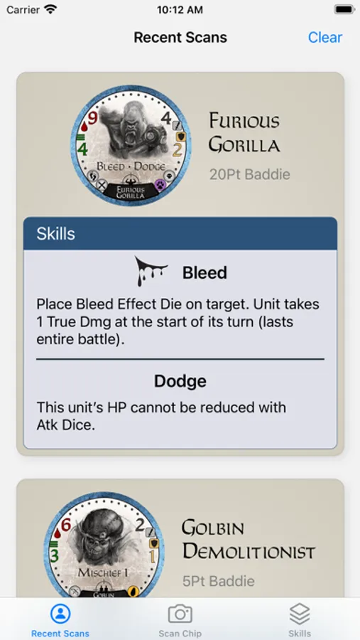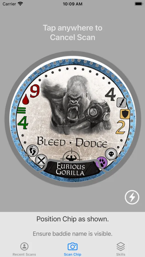 The app uses your phone's camera to quickly scan Baddie Chips, then displays detailed descriptions for all the Baddie's skills. No more needing to look up skills on reference sheets.